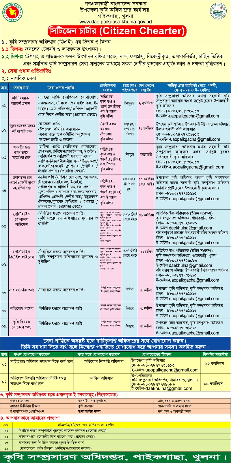সেবা সংক্রান্ত কোন অভিযোগ বা পরামর্শ থাকলে উপজেলা কৃষি অফিসার, কৃষি সম্প্রসারণ অধিদপ্তর, পাইকগাছা, খুলনা এর ফোন ০৪০২৭৫৬০০৪ অথবা ই-মেইল uaopaikgacha@gmail.com এ জানানোর জন্য অনুরোধ করা হলো।